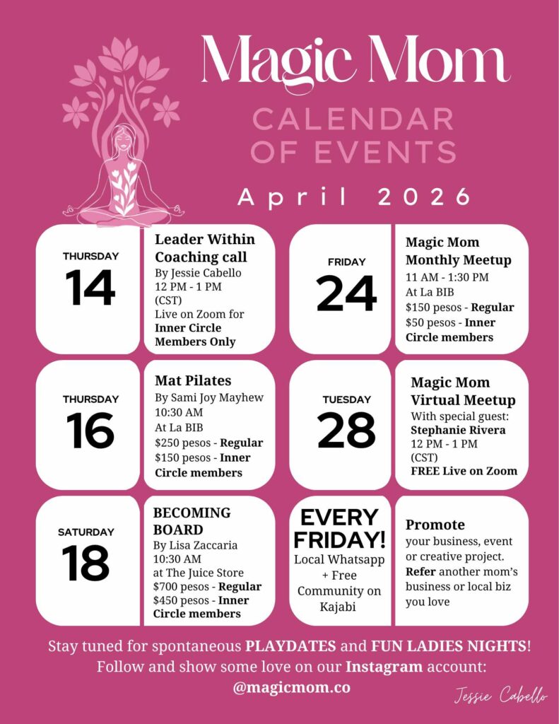 Ya seas residente local, expatriada o una madre visitante que busca una comunidad profundamente arraigada en Puerto Vallarta y en línea, Magic Mom te invita a bajar el ruido externo y confiar en tu brújula interior. Entra en un círculo donde eres vista, elevada y celebrada, porque cuando te lideras a ti misma primero, creas un legado de alegría e impacto.
